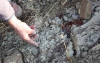 典型的なポンカ土壌。泥灰岩、砂質が押し固められたスレート状の石で石灰分を含み、水はけに優れて保温もできます。ポンカの層が色々な角度で表土、地中に存在する。その割れ目に沿って葡萄根が伸びていくことで下層部に伸びています。